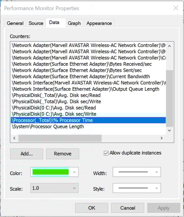 The data tab allows you to add or remove counters. For each counter, you can choose the color to display in the line graph and the histogram view. The width of the line and the dash style will also adjust the display.