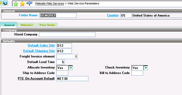 It is important that you fill in the Defaults values on the General tab. If you do not fill in these values you will receive errors when trying to process orders, especially the Sales Site and Shipping Site fields.