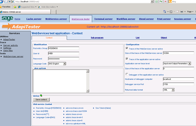 Go to the Web Server that is hosting the Web Services. Click on the WebService tester link. You need to fill in the following information. After you have entered the information then click the Save Context button.