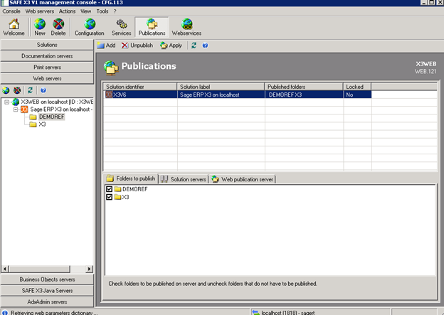 You need to select the X3 Web Server from the Left List, then Click on the Solution Identifier in the Right Window. The Folders will be displayed in the bottom window pane. Check the Folders you wish to publish to. Then click the Apply to publish the Web Services to the selected Folders.