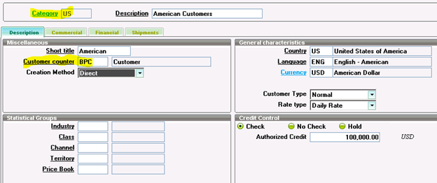 Before I go any further I should explain that Sage ERP X3 has a high-level category known as Business Partners (BP for short). A Business Partner can be a Customer as well as other types of interactive alliances that you may have. Yes they can even be multiple Business Partner types at the same time. This is a nice feature but I thought it worth mentioning since at first it may be confusing but also just to outline this before actually exposing it later in the article. The Seq Counter is then attached to the Customer Category. In this case you see it as 'US'.