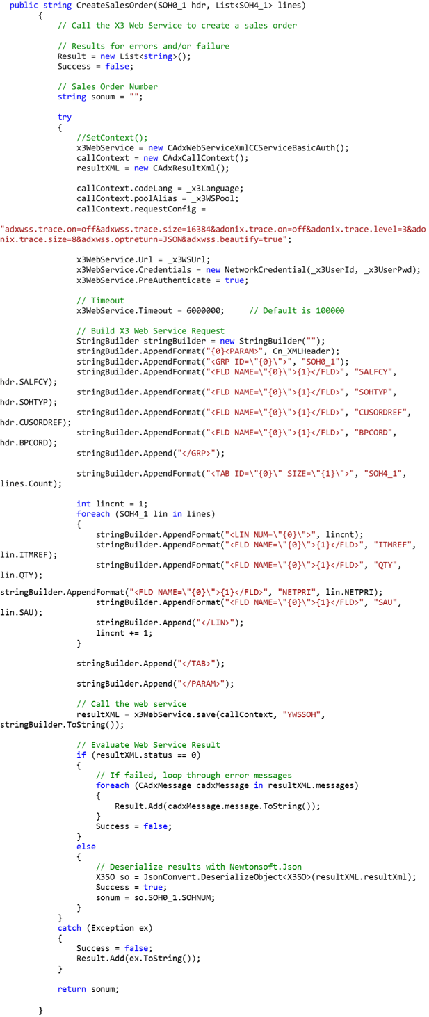 5. Below is the full code. This function creates a new sales order using the SOH object, and returns the newly created sales order number.