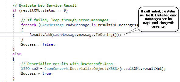 3. If the status is 1, the web service was successful. The web service result can be deserialized from an XML or JSON string into a pre-defined class.