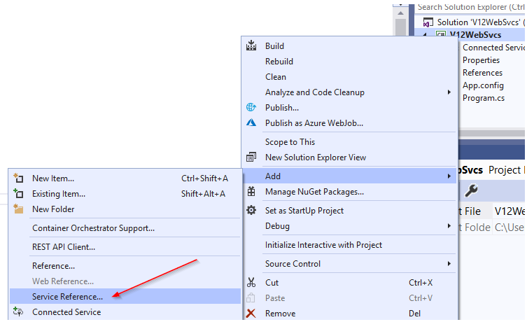 4. In the Visual Studio Solution, right-click on the project, and select Add > Service Reference.