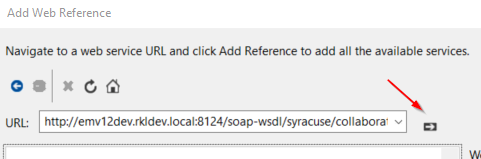 7. In the “Add Web Reference” window, paste the X3 Web Service URL into the URL box, then click the arrow to the right of the URL.