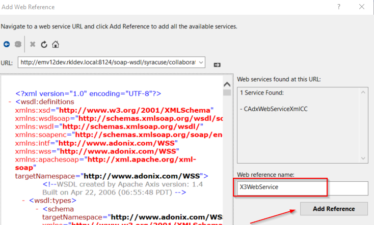9. Change the Web reference name to X3WebService, and click “Add Reference”.
