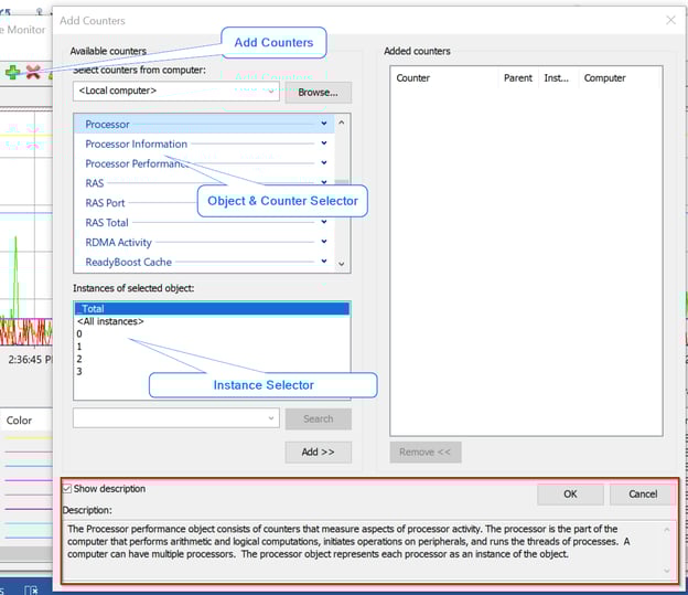 The Instance is a more granular detail of the selected counter. Instances can include each processor number, each named process, a drive letter, a NUMA node. There are two special instances, the _Total and the <All Instances>. The total will aggregate all the instances of the counter. The aggregate function depends on the counter type. The <All Instances> will create a separate metric for each instance that exists for the counter. This counter is sensitive to changes in operations. For example, when a new process is started, if you are monitoring the \Process\% Processor Time\<ALL Instances>, the monitor will start collecting data for the newly spun up process.