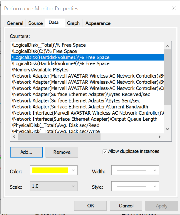 In the properties dialog, the Data tab will allow you to add and remove counters. The Add button will open the same Add Counter dialog as described before. The remove will remove the selected counters from the dialog. The allow duplicate instances will allow the monitor to display multiple lines or values for the same counter instance.