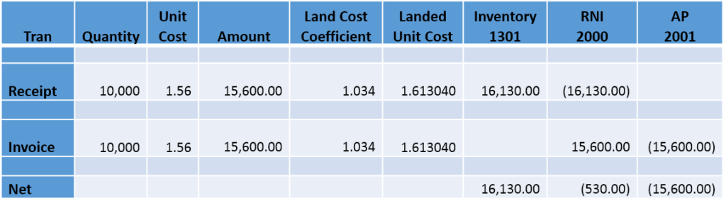 - Line 991 - The receipt debits the RNI account with the amount of the landed cost.