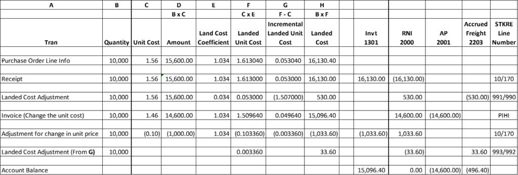 - Line 990 – The receipt credits the Accrued Freight account with the amount of the landed cost.