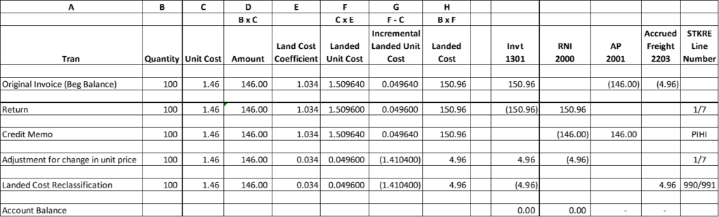 - Line 990 – The return credits the Inventory account with the amount of the landed cost.