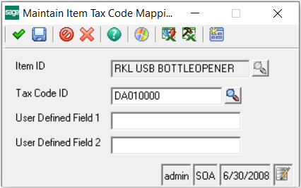 Once you have added the Product Tax Codes that you will need to utilize for your items in Sage 500 ERP, you can then assign each item to the proper Code using the task Maintain Item Tax Code Mapping (Figure #2 below). You simply repeat this for each item that you need to assign with a specific Product Tax Code. Any item that does not have a value assigned will utilize the default Product Tax Code called Tangible Personal Property (Avalara code P0000000) for tax calculations.