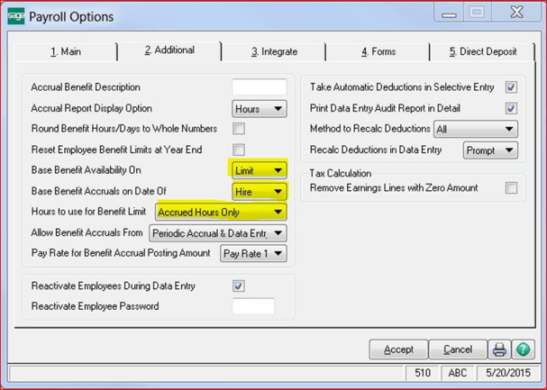 - Set Hours to use for Benefit Limit to Accrued Hours Only