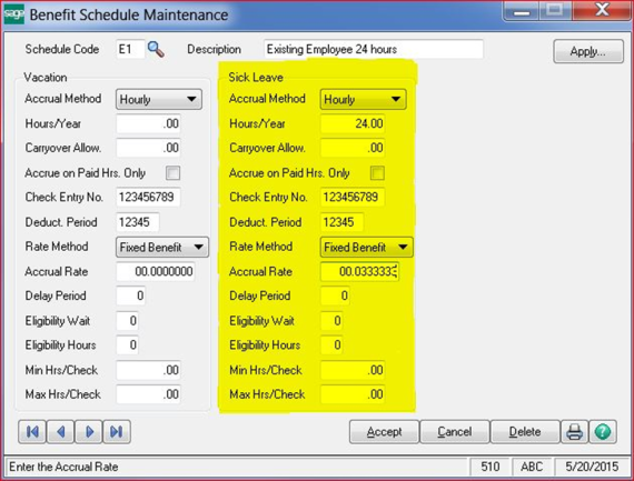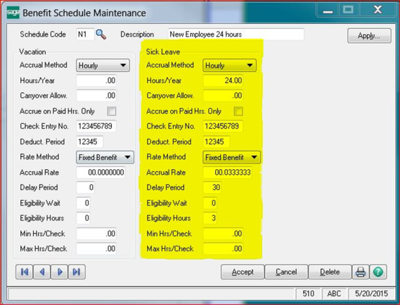 - Open Payroll, Setup, Benefit Schedule Maintenance