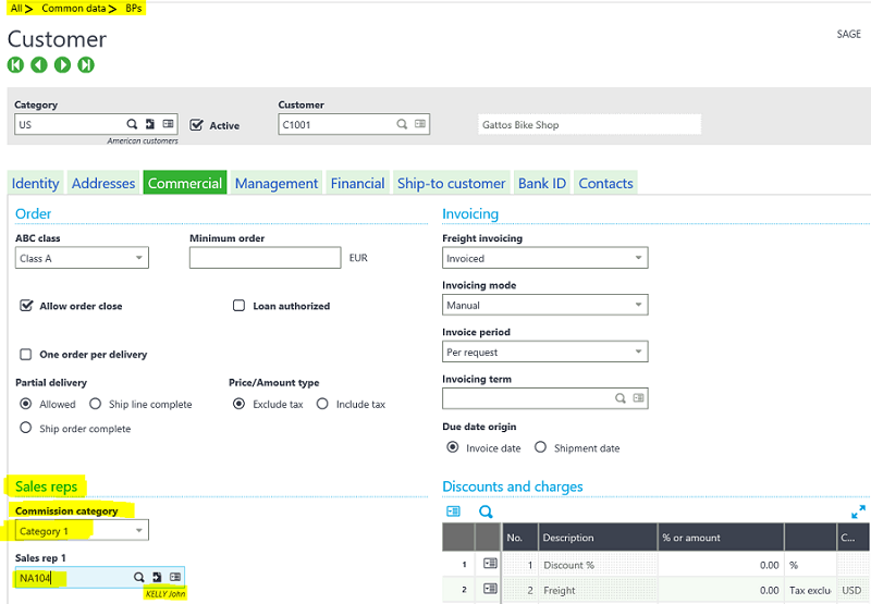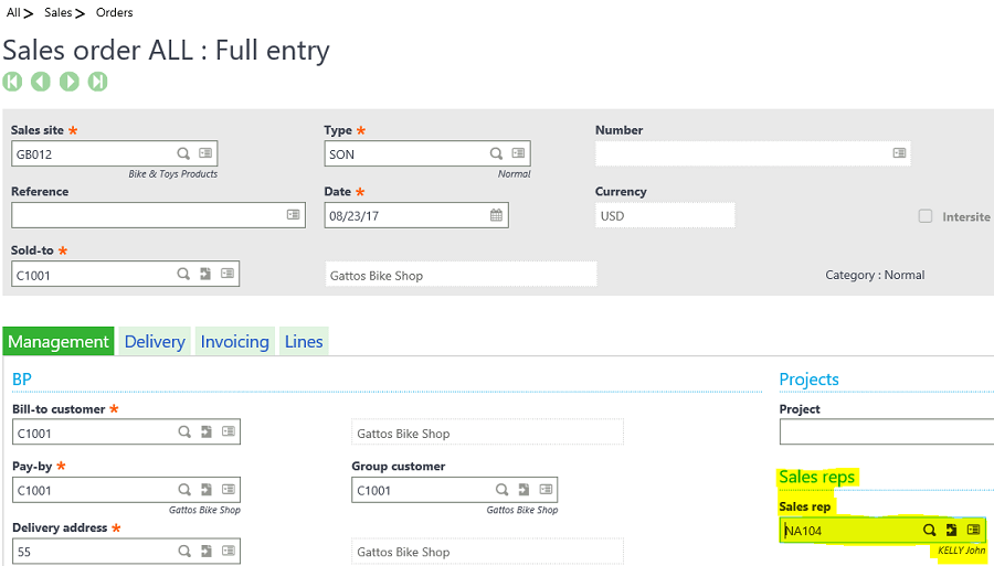 Notice John Kelly, NA104, sales rep is automatically assigned to the sales order. This is because the order is being sold to Gattos Bike Shop. I hope this blog post was helpful and provided a good starting point for commissions in Sage X3.