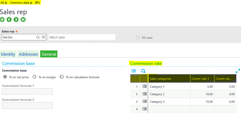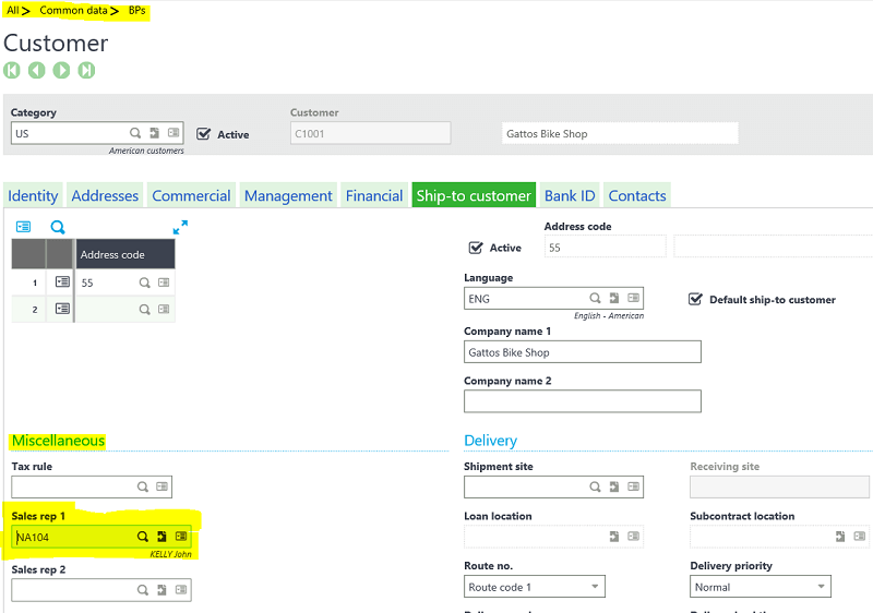 In the screenshot below, you can notice John Kelly, Sales rep NA104 is entered in as Sales rep 1 under Miscellaneous.