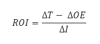The formula may be read as: “ROI = (the change in Throughput less the change in operating expenses) divided by the change in investment.” Throughput, here, carries a very specific accounting definition being revenues less truly variable costs (TVCs).