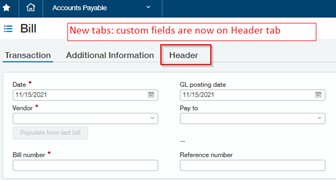 - Go to Platform Services > Custom Fields > Filter to Object "AP Bill" Edit each custom field & change the tab that field appears (Note: If Custom Fields are in AR module, then Object will be “Invoice”)