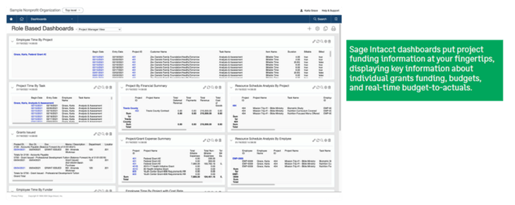 Many grants reimburse expenditures instead of providing upfront payments, making it crucial to consistently monitor your expenses, budget, and cash flow. Imagine submitting a reimbursement request only to discover that your expense does not meet the grant's criteria or, conversely, failing to track your spending, which leads to overspending without sufficient grant funds to cover your costs. A modern cloud accounting system allows you to gain immediate insight into your revenues and expenses, including those related to grants, from anywhere in the world. For instance, Sage Intacct shows immediate insights about your financial standing by tracking your spending and comparing it to your budget. It also facilitates reporting and comparing budget versus actuals for grants with reporting periods that differ from or span across your fiscal year.