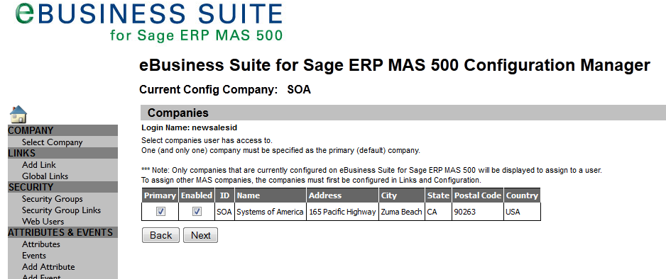 Select the Primary and Enabled for the company’s the user will be associated with and click Next.