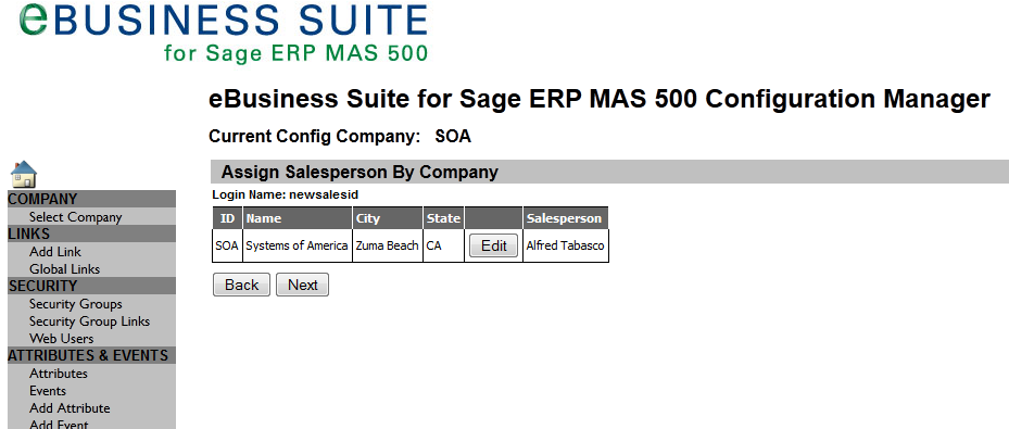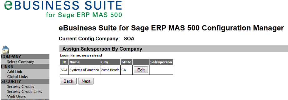 Click on the Edit button to attach this login name for the selected company to a Salesperson ID.