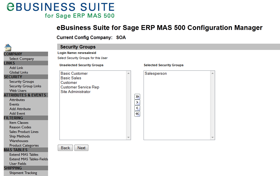 Click Next above to continue. You will go to the Security Groups page shown below. Highlight the Security Groups that you wish to assign to this login name and click on the ‘>’ to move. Below I have only assigned the Salesperson Security Group. Click Next.