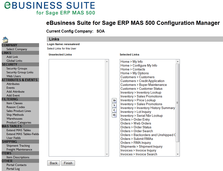 This will present the Links page as shown below. The Links you are presented with are the ones defined for the Selected Groups from the prior page based on what was assigned in the Security Group Links and click on the ‘>’ to move. Click Finish.