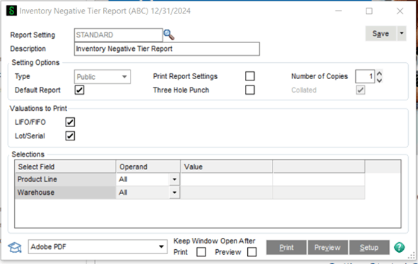 - Open Inventory Management > Period End > Inventory Negative Tier Report
