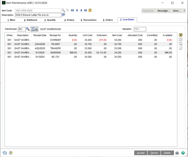 When reviewing the 1st line item in item maintenance this is what it shows on the cost detail tab.