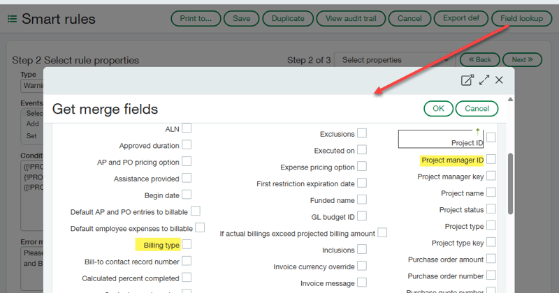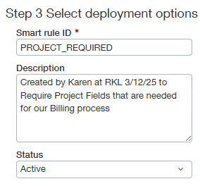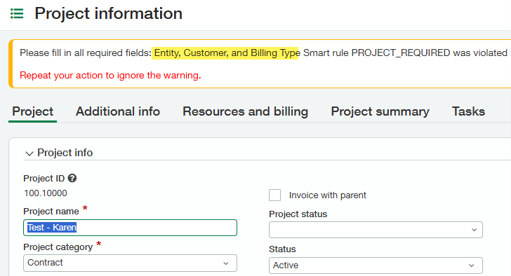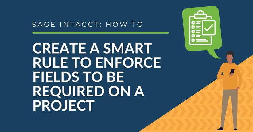 Solution: Create a Smart Rule to Require specific fields on the Project setup. Smart Rules are used for Data Validation on Master data or on transactions. They trigger when the entry is saved or the transaction is posted. Here are steps to creating your own Smart Rule for Project Data Validation.