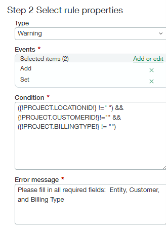 - Condition: Enter a condition for your Smart Rule. To require fields, we want the condition to be: {Field Name} !=”” which translates to “can not be Blank”. To add multiple conditions use the syntax && in between fields. See Example below to require Entity, Customer, and Billing type.