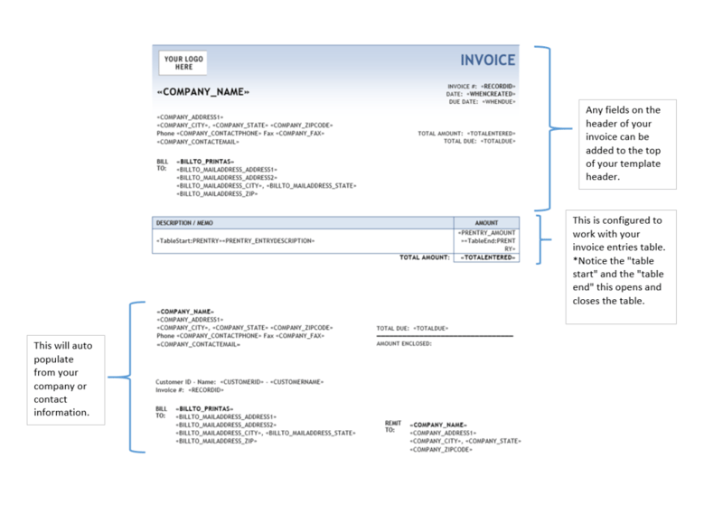 The most noticeable difference between header/footer fields and the fields in the table is the need to start with “table start” and end with “table end.” These are required for the table rows and not the total row. In the example below, the Description / Memo column starts with {MERGEFIELD TableStart:PRENTRY \* MERGEFORMAT } while the Amount column ends with {MERGEFIELD TableEnd:PRENTRY \* MERGEFORMAT }.