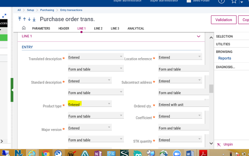 In Purchase Orders, the product type field can be entered, displayed or hidden. For the other entry transactions it can only be displayed or hidden.