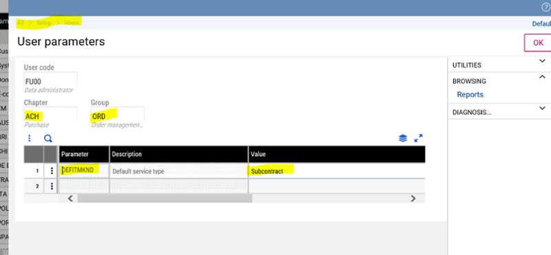 The new parameter, DEFITMKND is under Setup > Users , Chapter ACH, Group ORD.