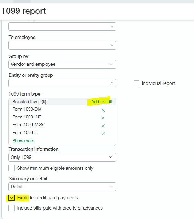 From this screen, you can select your reporting year and entity. At the bottom of this screen, you will be able to select the form type for which the report will be displayed. You may want to view all forms or only view one form. For example, you may only want to select "Form NEC." In addition, most users prefer to see this report with credit card payments excluded.