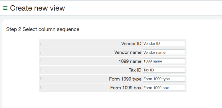 After you have selected “create new view,” you will be prompted to select the columns to display. In this case, you will need the Vendor ID, Vendor Name, 1099 Name, Tax ID, Form 1099 Type, and Form 1099 Box. You can uncheck any boxes that aren’t relevant to this view.