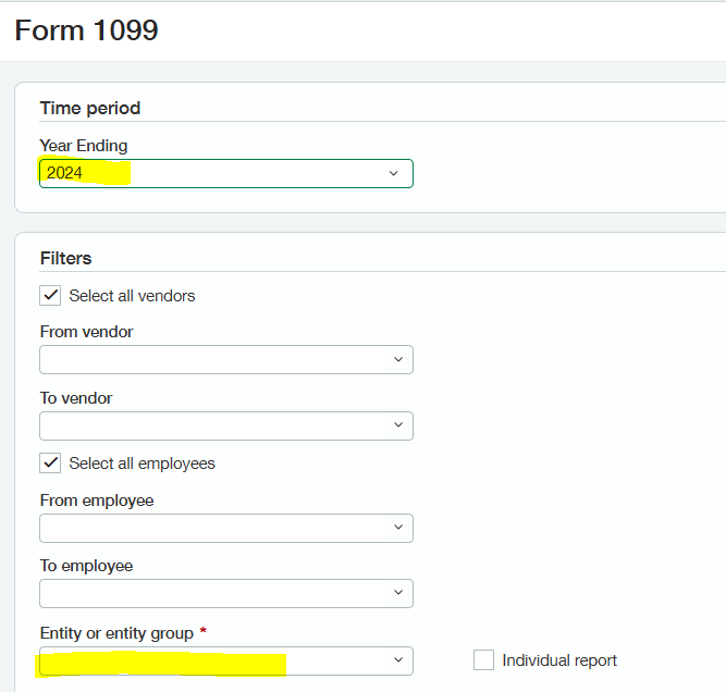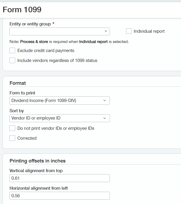 The first field is the time period, and the second required field is for the entity. If you have a large number of vendors, you may want to split the list alphabetically for printing. This can be accomplished through the vendor fields. In addition, if you need to issue a corrected form, you can use the vendor fields to isolate the vendor and then check the box for “corrected.” Please only check this box when printing corrected forms, not when printing new forms.