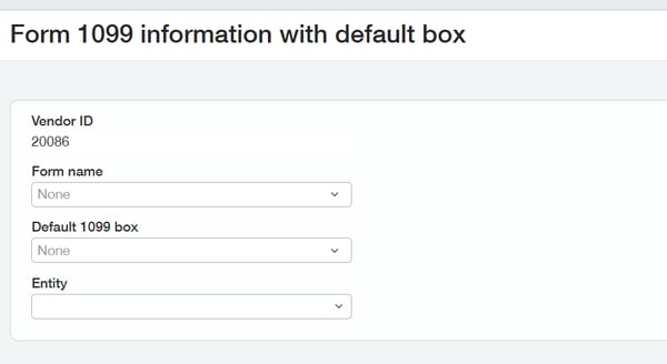 Upon hitting save, a new window will open displaying the 1099 information. From here, you will select the form name (example: Form NEC), the box (example for NEC: box 1), and, if applicable, the entity name. If this vendor has the same information across entities, you would leave this blank. Hit "Save" to save the 1099 information.
