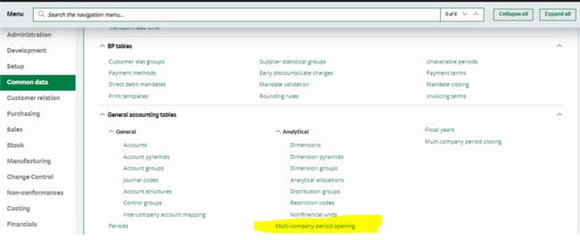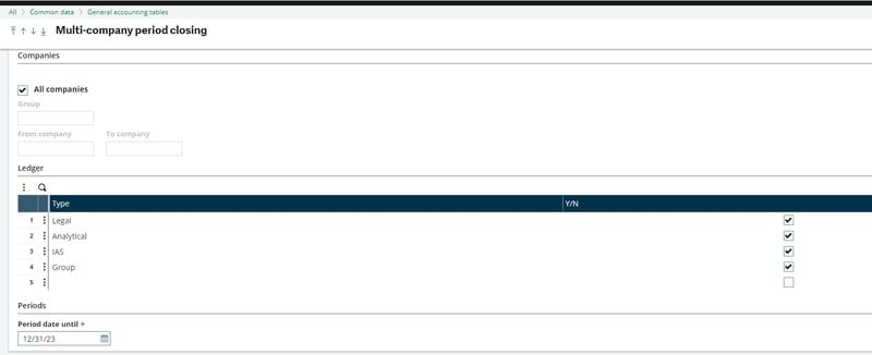 - Go to Common Data > General accounting tables > Multi-company period closing (FUNPMCCL)