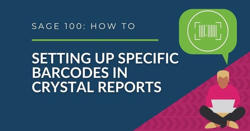 This blog advises how to set up certain kinds of barcodes in Crystal Reports. Sage 100 workstation setup includes an Azalea font prerequisite install for the use of changing a printed data field into a barcode, within Crystal Reports. Any field, in Sage 100, can then be printed as a barcode using Crystal Reports and the associated Azalea fonts.