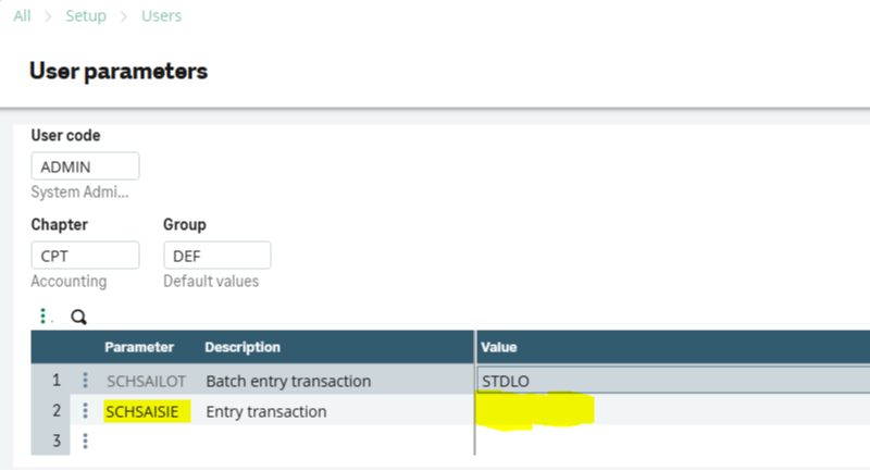 - You should see the user parameters details for Chapter "CPT" and Group "DEF." The value field for the parameter "SCHSAISIE" should either be set to "1PAGE" or blank.