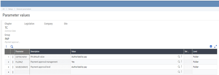 - DEFBONPAY (Payment approval default value) – Used to define the default approval at the user level. This must be consistent with the maximum level of the user parameter settings and must be smaller than or equal to this level. This is available at the folder and user level.