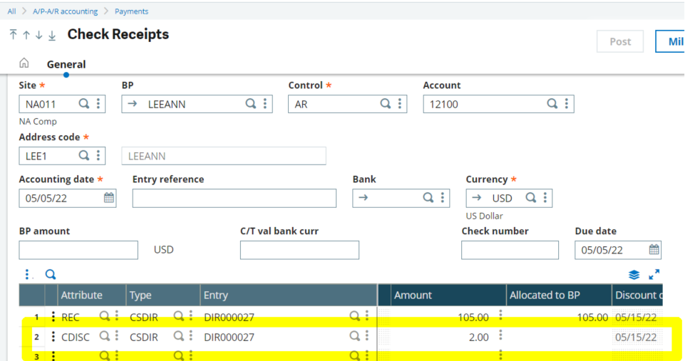 - Note that when selecting the open item (invoice) from the left list, the discount will auto populate on the next available line in the grid