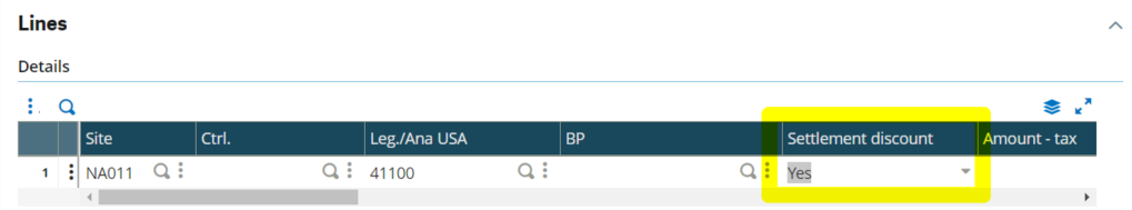 - Yes - when this parameter value is set to 'Yes', the early discount is calculated and the discount line is generated according to the discount rate set up for the open item.