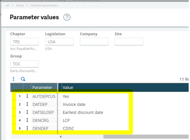 - Go to Common Data > BP Tables > Early Discounts/Late Charges