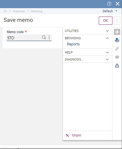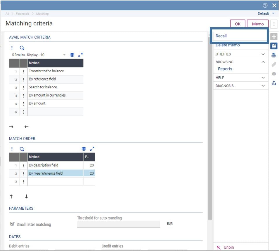 - Click on ‘Recall’ to select the saved memo code and criteria options