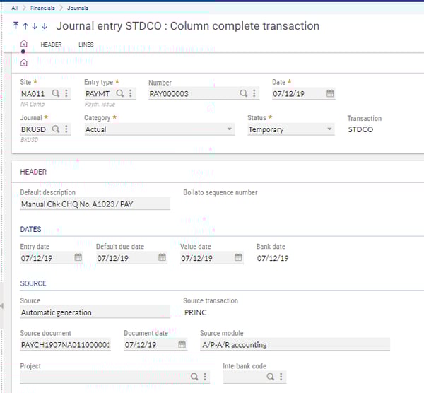 After adding the field to the entry transaction you can now see which automatic journal was used to create the automatically generated GL entries in Sage X3.