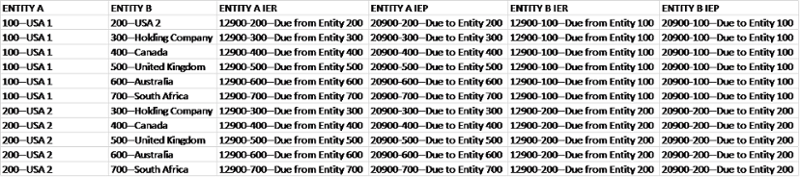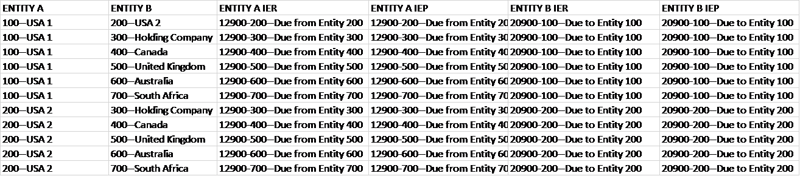 | E100 - Entity A | 19100 - E100 Inter-Entity Receivable | 29100 - E100 Inter-Entity Payable |