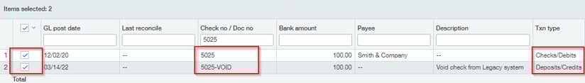 - Bank Reconciliation: Match the original legacy check to the void entry entered in step #2 which will clear both from the bank reconciliation