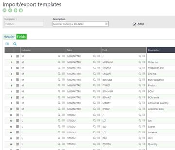 Below is an example of an import template copied from the base MKMS import template, for material tracking against a work order.